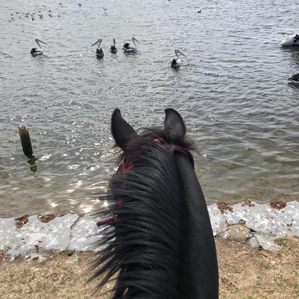Now at this stage I remember that my stock saddle was in having repairs so there I was heading out in my dressage saddle for was can only be described as man from snowy mountain riding flat out up and down sand hills at a minimum of a canter (I don’t do canter happily) well lucky I had sarge who barrelled along with our host looking back as he took a sharp left straight up a dune to show us the view.